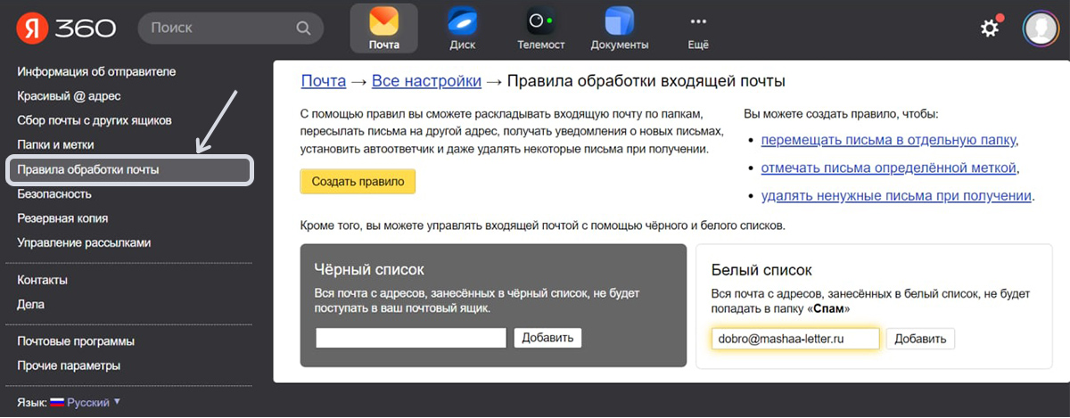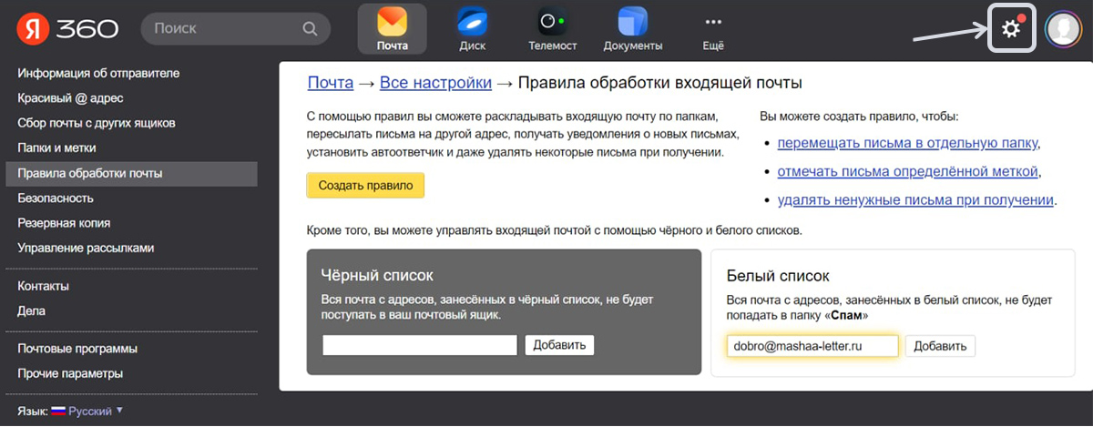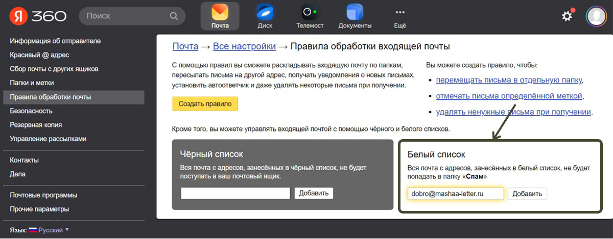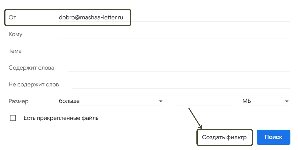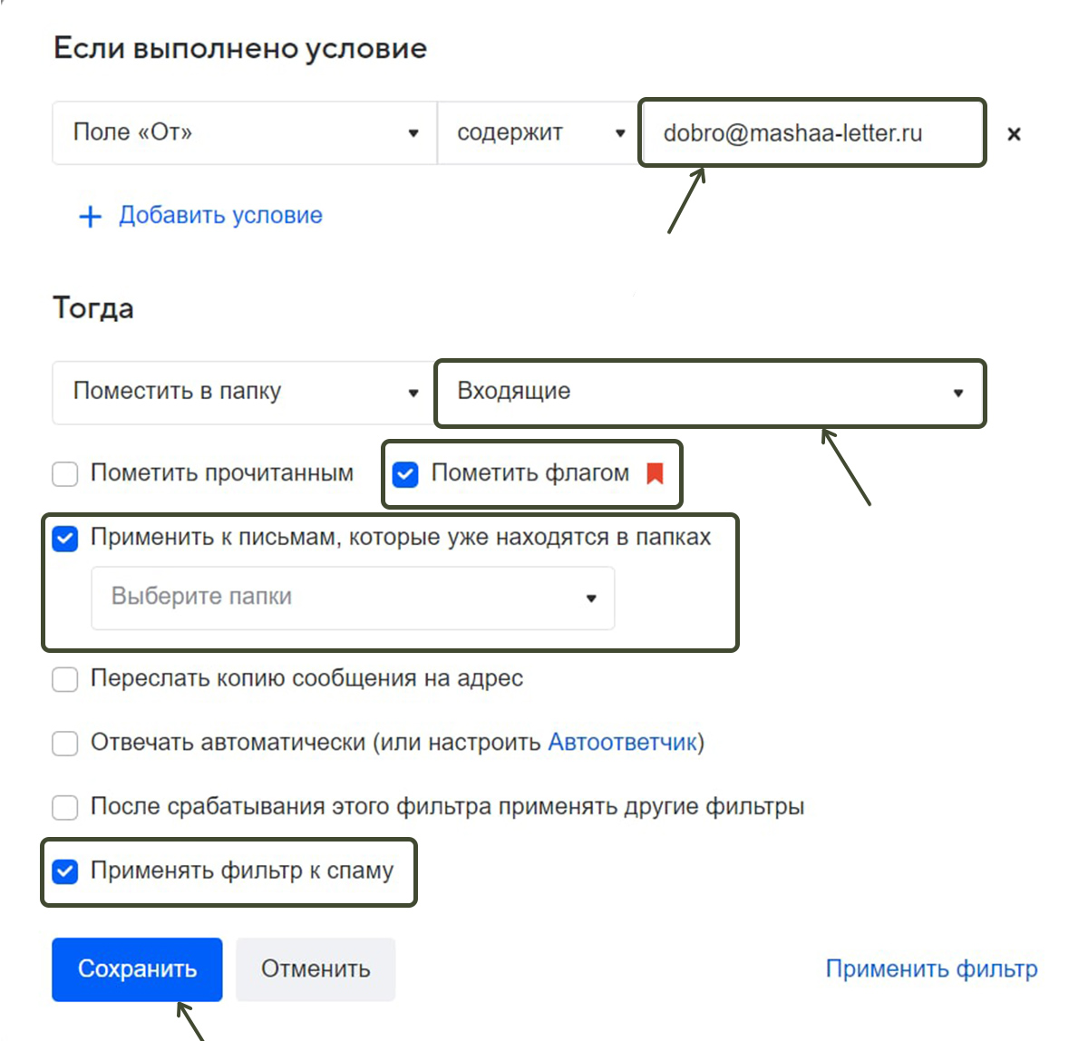 3. Поле «От» содержит электронный адрес dobro@mashaa-letter.ru, затем поставить все галочки: