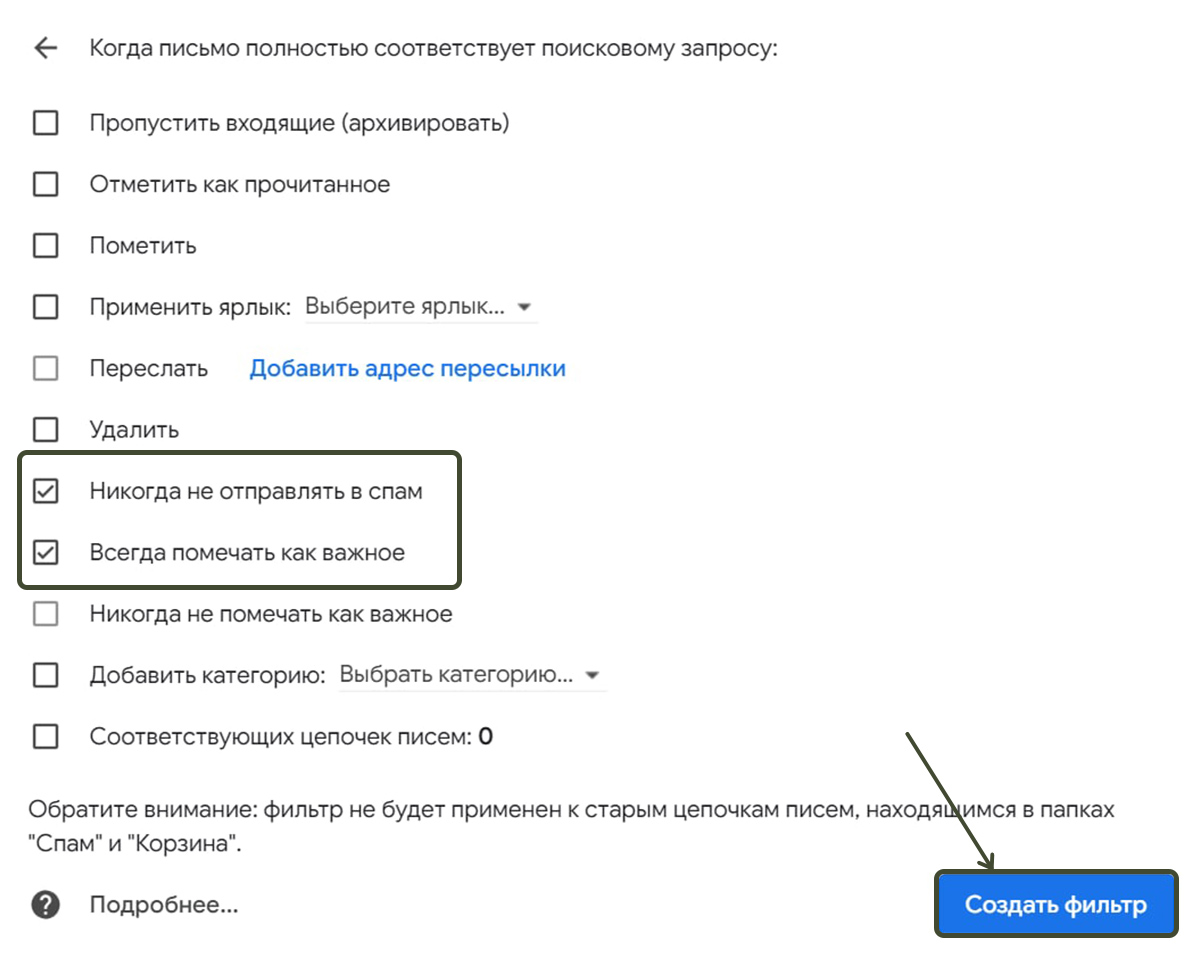 Применить к письмам, которые уже находятся в папках (указать все существующие папки)